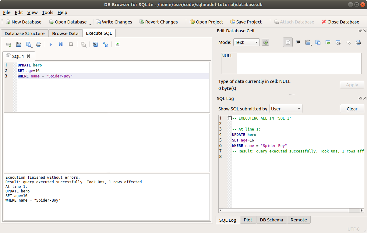 INFO Engine UPDATE hero SET age=? WHERE hero.id = ? INFO Engine [generated in 0.00017s] (16, 2) INFO Engine COMMIT